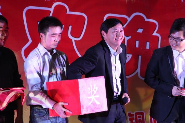 今年,在公司領導的支持下,增發(fā)了50多個幸運獎,大大提高了中獎率,也為新年討個好彩頭。有獎猜猜猜環(huán)節(jié)讓全場達到一個小高潮,猜歌、猜圖片,猜成語讓場上場下互動起來了,知道答案的觀眾高高地舉起手,一個個都恨不得站桌子上,好讓主持人把話筒遞過來,讓自己說出答案,小孩子們更是感興趣,都跑出席位,來到臺前爭搶機會說答案,他們除了想告訴大家,我聰明,知道答案之外,其實心里惦想著待會能從錢箱里抓出多少錢,醉翁之意不在酒,在閃亮亮的硬幣啊。